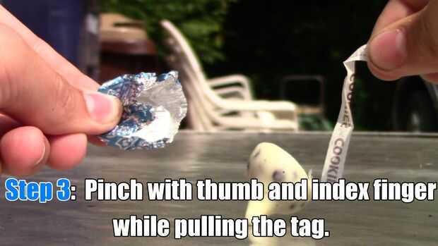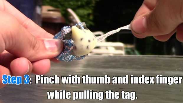 A continuación, pellizcar con el pulgar y el dedo índice en la mano opuesta mientras tira de la etiqueta (ondulación de Niggly). Hacer todo esto al mismo tiempo y vendrá la parte de la envoltura que está utilizando los dedos de la mano contraria agarrar aparte de la etiqueta. Kiss de Hershey realmente se deslizará fuera de la envoltura, mientras que la etiqueta se tira rápidamente de la envoltura. El caramelo dentro ahora caerá fuera de la envoltura. Todo esto se hace en menos de un segundo, lo que es una de la más rápida, si no el más rápido, maneras de abrir Kiss de un Hershey!