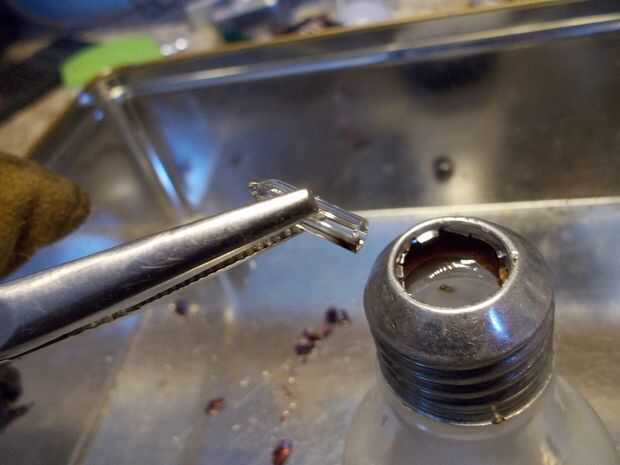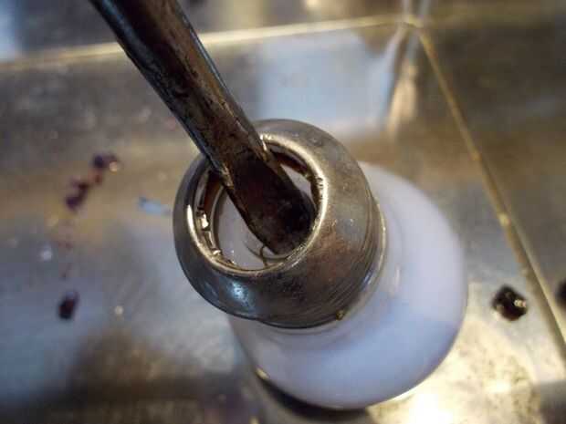 El resto el presión del tubo de descarga puede ahora quitarse con su destornillador cuadrado pequeño y empujarlo hacia un lado hasta que se rompe completamente dejando la prensa del vástago y el tallo intacto.