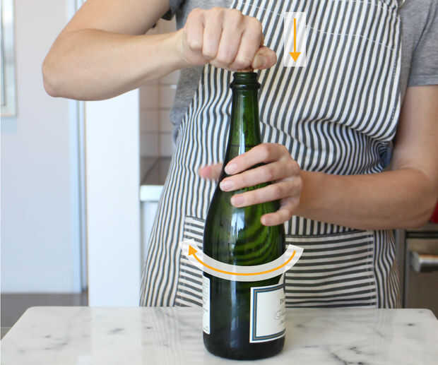 3. como estás sosteniendo el corcho y empujando hacia abajo, lentamente giro * la botella cualquier dirección manteniendo el frasco firmemente sobre la superficie de trabajo.