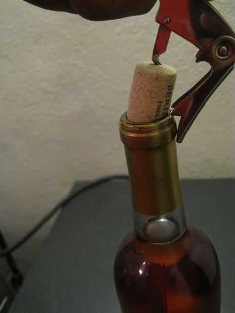 tenía un problema con el corcho en una botella de vino y lo resolvi usando presión de aire para eliminar lo que quedaba del corcho. Presión de aire puede utilizarse para abrir cualquier botella de vino.La foto muestra el dispositivo que hice. Es una