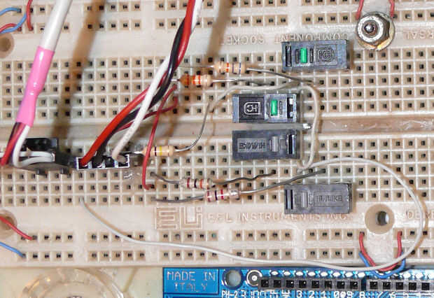 Después de construyeron, me doy cuenta ahora que el resistor de 1K probablemente no es necesario. Uno de los botones puede conectarse directamente a 5V, por lo que necesita una resistencia menos de botones (y el una desplegable resistencia compartida por todos los botones). Si uno de los botones está conectado a 5V siempre debe devolver un valor de 1023. Así que si desea guardar un par de centavos, dejar la resistencia sobre el botón 1.