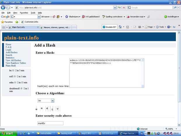 Espere hasta que lm tiene 0/2 o 1/2, haga clic en Añadir hashes, pegar lo que copiaste en el cuadro de mensaje, elegir algorytm LM, ingrese el código y pulse enviar.