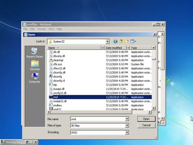 Ir a Windows y System32. Una vez en sistema 32, haga clic en "archivos de tipo" en el cuadro central en la parte inferior de la ventana y seleccione "Todos los archivos." Ahora Desplácese hacia abajo y buscar "cmd" luego hacer una copia de la misma. Usted debe obtener un archivo llamado "cmd - copia" o algo similar.