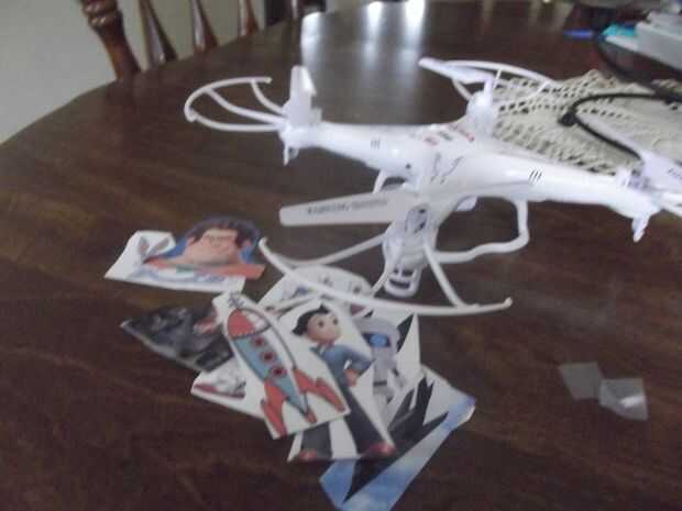 Usted necesitará un zángano, tarjetas, una computadora, tijeras y cinta. Impresión de las imágenes que desee en tarjetas, recorto y asegúrelas con cinta adhesiva a los aviones no tripulados