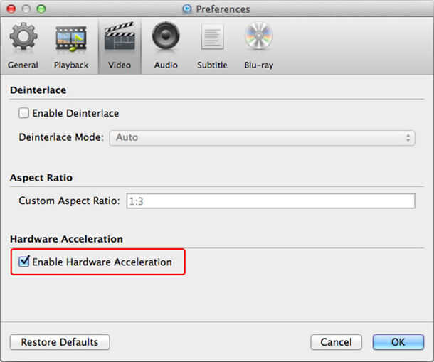 Haga clic en "Video", verás una opción de "Activar aceleración de Hardware". Controlarlo y haga clic en "Aceptar".