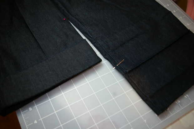 El primer paso es intentar en los pantalones y haga una marca en la nueva longitud del dobladillo deseado. La longitud deseada se caracterizó en este par de pantalones con un alfiler de cabeza de cristal rosa. Búscalo en la pierna derecha, cerca de la parte superior de la fotografía. Esto es la marca más importante que haces en los pantalones como esta será la longitud final.
