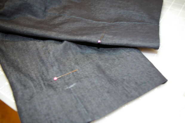 Gire el manguito hasta la nueva longitud del dobladillo deseado. En esta fotografía la línea de tiza blanca es la nueva longitud deseada y las clavijas están marcando donde fue cosido el dobladillo a la pierna del pantalón. Doblar el manguito en la nueva marca de longitud deseada. Presiónela en su lugar. Una vez presionado, virar la parte superior de la banda hasta "cosiendo en la zanja". Esto sólo significa cosa algunas puntadas a lo largo del borde superior de la banda derecha en la parte superior de las costuras en la pernera del pantalón. Si utiliza hilo de juego no se mostrará. Probablemente cuatro o cinco puntadas hacia abajo y hacia atrás es todo lo que necesita.