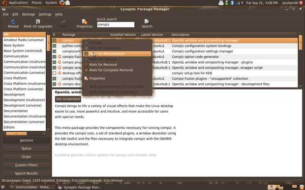 Por lo tanto, en primer lugar, ir al menú sistema hasta arriba, luego a administración, luego al gestor de paquetes synaptic. tipo "compiz" en la barra de búsqueda. derecha haga clic en todos los archivos que tienen el nombre compiz delante de ellas y marcan para la instalación. y, bueno, sabes, instale!