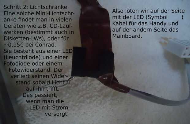 Ahora toma su sensor fotoeléctrico (que se encuentra en muchos dispositivos) o opto-aislador y soldar dos cables al LED (normalmente la-| > |-símbolo) y en el otro lado de la soldadura de los extremos del interruptor de potencia.