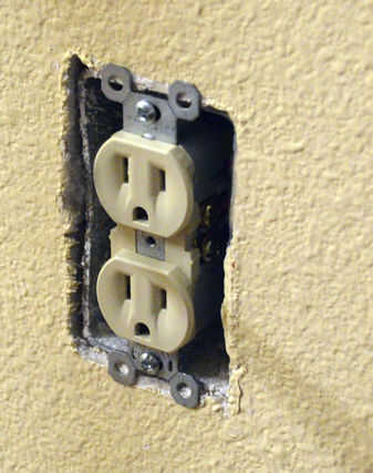 Una vez que la placa frontal está apagado, usted tendrá algo similar a lo que esta en la foto. El receptáculo es gracias a 2 tornillos, uno en la parte superior y uno en la parte inferior. Retirar y exponer el recipiente de 3 hilos. Negro (alambre caliente), White(neutral) y cobre (tierra).