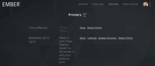 Ahora haga clic en impresoras, encontrar la impresora emparejada para recibir la actualización de firmware y haga clic en el enlace "Actualizar Firmware". La actualización de firmware será enviada a la impresora. Usted recibirá una confirmación en emberprinter.com cuando la actualización esté completa.