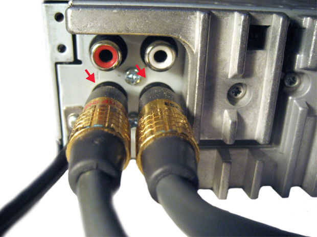 Ahora los cables RCA son lo que llevan la señal al amplificador el amplificador sabe qué frecuencias para poner hacia fuera a los subs. La parte posterior de su radio tendrá dos orificios como se ve aquí un rojo (izquierdo) uno blanco (derecha) Inserte el extremo RCA rojo en el agujero rojo y el extremo RCA negro en el agujero blanco. Se ejecutará este cable RCA para la conexión de entrada de RCA para el amplificador como se ve en la siguiente diapositiva.