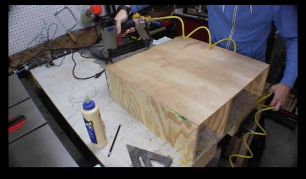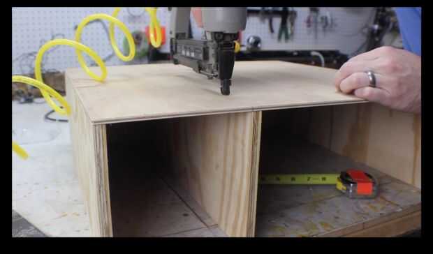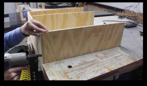 Cortar madera contrachapada hasta el tamaño que desee el gabinete, con un separador de ambientes y conectar las piezas con clavos pegamento y brad.
