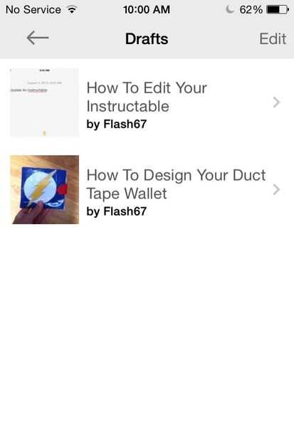 En los borradores puede elegir el instructable que desea editar en mi caso "Cómo diseñar la cartera de cinta del conducto" y se puede editar como si todavía se lo que es. Si el instructivo que desea editar no está allí que usted también puede elegir de publicado.