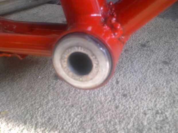 Ive tuvo que ir por el camino de conseguir una vieja caja de pedalier para caber en el tubo de bb como el thompson un dosnt ajuste como la parte trasera vienen a través del tubo. Afortunadamente encontré un tubo de soporte inferior en una suspensión trasera antiguo que era el mismo diámetro que el tubo en mi carpeta con un poco de afinarlo equipado (con un mazo). I t fue sólo cuando traté de los conos de soporte inferior del tornillo en que me di cuenta de que el primer extremo para empujar en el marco había colapsado un poco (era un ajuste muy apretado). He pensado en comprar un grifo y encuentran una fortuna. Tomé una concha vieja y tierra cuatro ranuras respaldado entonces lo relevante para producir mi propio grifo. No puede ser duro como un toque real pero funcionó. Las carcasas y el eje entonces fueron atornilladas en el marco y el brazo de biela montado.