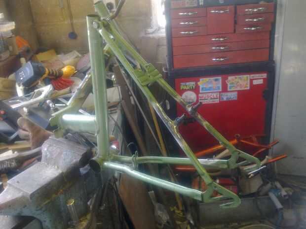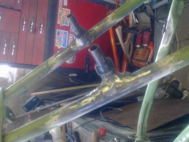 a continuación me volví mi atención a los frenos. Al principio jugó con pegarse con las pinzas de sidepull original que venía en la moto pero se veían de manera más allá de su mejor. Entonces decidió usar los frenos cantilever que vinieron "gratis" en mi bici de donantes. Hacksawed los jefes para los frenos de la bici de los cabritos, forma con una ronda de archivo y soldadas a la estructura de carpeta. Para calcular la altura del centro para los jefes configurar los bloques de freno en su punto medio entonces llevó a cabo contra el borde de la rueda que más o menos donde debe ir el jefe. Incluso si se encuentran un poco fuera de su posición hay un montón de ajuste en los bloques de este último.