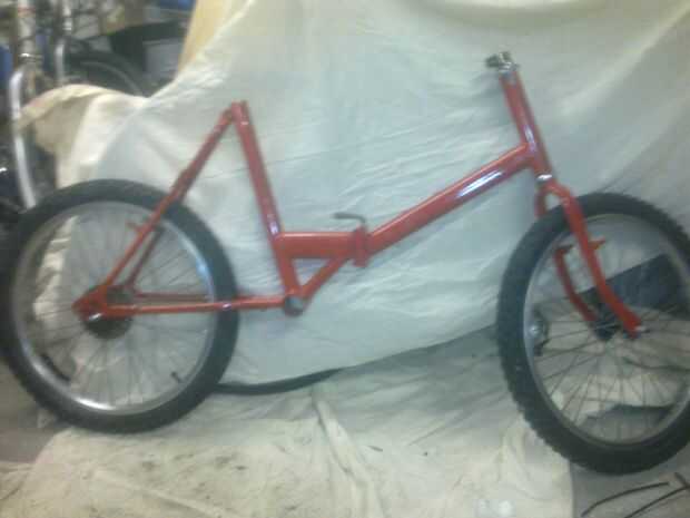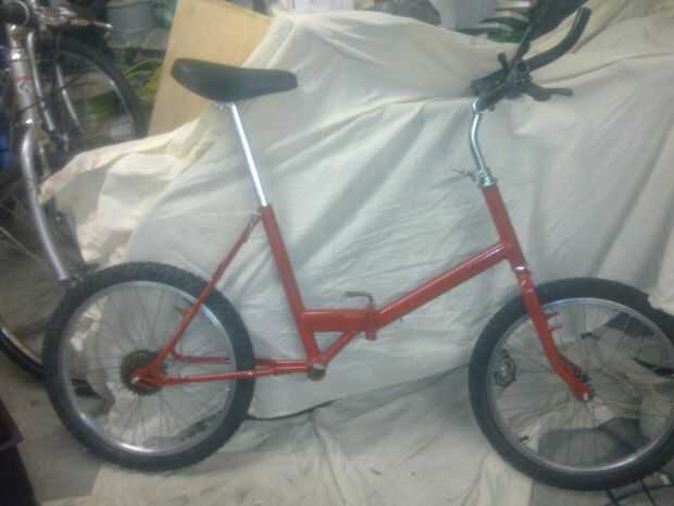 No podía esperar a la semana y también consiguió llevado a reconstruir para acordarse de tomar fotos. Las horquillas fueron engrasadas usando grasa de bicicleta refited. Entonces las ruedas fueron atornilladas en su lugar. El deraileur, tija de sillín y manillar era próximo. Juntos fue muy rápido y soy bien contento en la mirada de la moto. Las palancas de ajuste (para la altura del asiento, altura del manillar y para plegar la bicicleta) no han subido muy bien y están un poco oxidadas pero reemplazar o rechrome costaría demasiado, que supongo que siempre pude pintar plata.