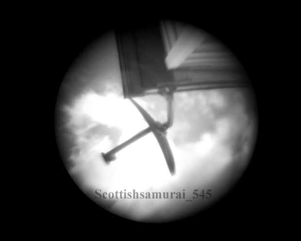 Foto 1: Mirar directamente a una antena parabólica en una esquina del techo. He utilizado la cámara en "auto" con una longitud focal de 140mm (equivalente a 135mm en película) con ninguna ampliación digital. La foto fue recortada y representa una escala de grises en el GIMP.