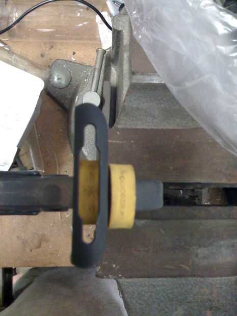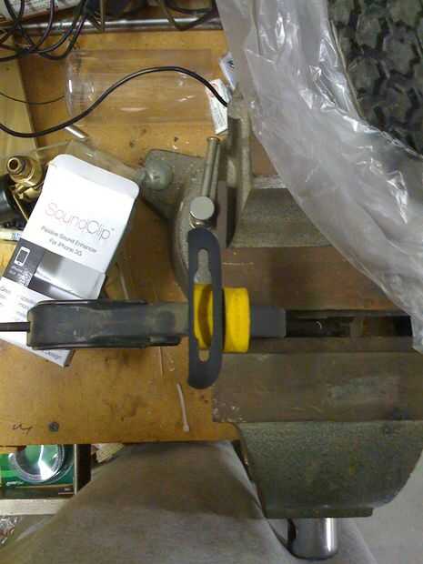 En verdad empecé tratando sólo el caso en una mano y la Dremel en el otro. Después de darse cuenta que no tenía las manos del cirujano decidí afianzar con abrazadera en algo suave. Si no dispone de una abrazadera de caucho, aferrándolo con un pedazo de cuero de desecho, o un trapo viejo junto con una abrazadera metálica funcionará sin rayar el caso.