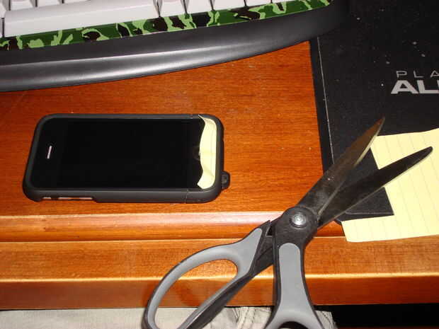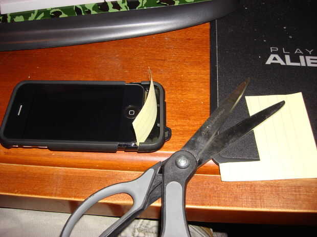 Corte el papel que quepa entre el caso y el iPhone. y proceda a adjuntar junto con el SoundClip así. Normalmente depende de la SoundClip metiendo 2 dientes en la "toma" del iPhone así que adelante y empuje los dientes a través del papel.