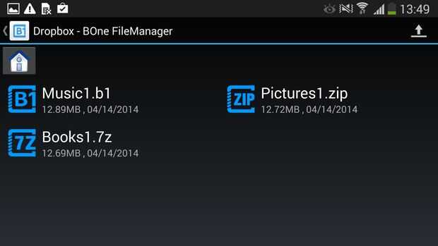 Una vez completada la conexión, tendrás acceso a tu almacenamiento de archivos de Dropbox en interfaz de administrador de archivos de B1. Ahora puede cargar archivos en la nube pulsando el botón de subir en la esquina superior derecha o descargar archivos en su dispositivo, simplemente tocándolo.