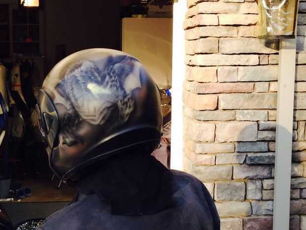 1. una vez que estés satisfecho con tu imagen con aerógrafo, añadir varias capas de capa clara. Honestamente he añadido entre 8-10 capas ligeras. Si intenta solo spray una capa gruesa de la capa clara comenzará a ejecutar y seco como una pasta en su casco... así que lo mejor es rociar un poco, espere que se seque y rociar nuevamente. Mediante la adición de varias capas, esto "" permitiría el casco que trabajo bajo la lluvia sin riesgo de que su trabajo lavado.