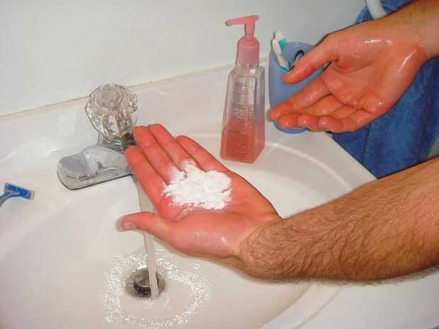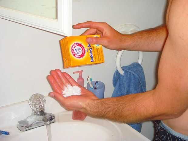 Verter algunos bicarbonato de sodio en la palma de su mano. realmente no necesitas demasiado, así que creo que fui un poco por la borda en esta foto. Sólo añadir un poco de agua caliente al bicarbonato de sodio y se mezcla en una pasta thickish.