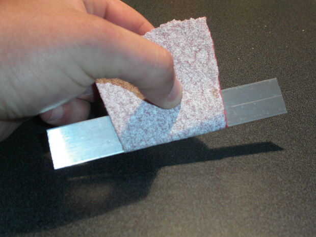 Normalmente se utiliza vidrio cubierto en papel de lija para poner un borde sobre una superficie metálica porque cristal es típicamente muy suave y muy plano. Aquí utilicé un trozo muy fino de la hoja de aluminio ya que es casi plana y lisa como el vidrio, y es más delgado que el cristal que tenía por ahí.