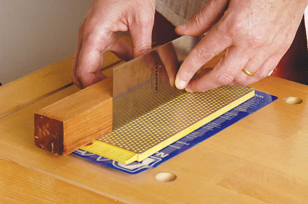 Una vez presentada, debe eliminar el archivo con un medio diamante fino o waterstone, (alrededor de 800 o 1000 grado). Para evitar ranuras de corte en la superficie de su waterstone, use los lados estrechos para perfeccionar su rascador. Tenga cuidado de mantener el ángulo de 90°. Una vez que estés feliz que hay ningún gancho de izquierda en todos los bordes son limpios y afilados, es hora de crear un nuevo gancho, ver imagen.