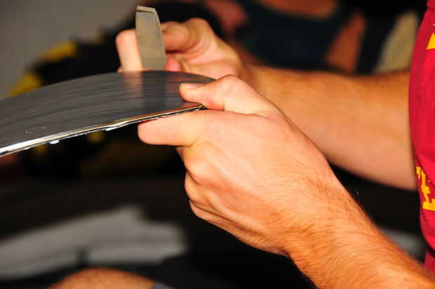 Este paso es para afilar sus aristas. Esto requiere el archivo que se incluye en el kit de herramientas. Primero afilar los lados de sus bordes con la herramienta de borde incluida. Pasar otra vez de la nariz a la cola de la Junta y no hacia adelante y hacia atrás. Próximo a 45 * ángulo Presione el archivo contra el borde de la Junta y el archivo a usted con la lima plana. Archivo sólo en una dirección, no hacia arriba y hacia abajo. La nitidez de la placa depende del estilo que escojas para viajar. Un piloto acrobático tendrá un borde redondo para ayudar a evitar que se contagien en cajas y los carriles.