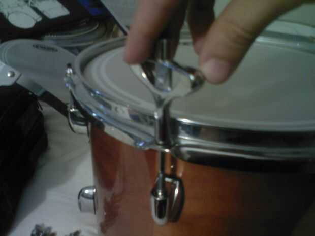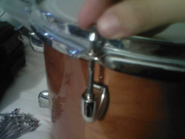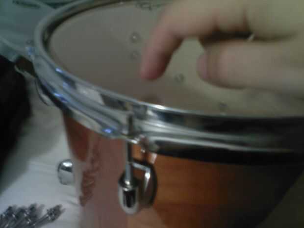 Encontrar la parte inferior del tambor (si no puedes descubrirlo solo busque la insignia y luego Voltéela boca abajo). La cabeza resonante en la cáscara y luego colocar el aro del metal de. Insertar todas las varillas en los agujeros del aro y estén en consonancia con los estirones en la cáscara del tambor. La mejor manera de empezar es apretar con los dedos las varillas en las zapatas, uno a la vez, va alrededor del tambor. No apriete aquí, sólo Verifique que las varillas queden firmes y que no se puede mover el aro hacia delante y hacia atrás a través de la cabeza.