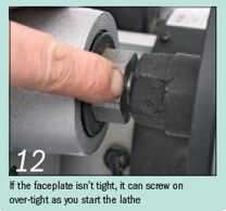 Cuando empieces a colgar piezas grandes y pesadas en el eje, es vital que la placa se atornilla hasta firmemente antes de empezar el torno. Es tan fácil dejar una fracción de una vuelta apretado; entonces tan pronto como ponga en marcha, la inercia de la chapa hace que atornillar con un golpe post-beta. Esto hace extremadamente difícil de eliminar después, Foto 12.