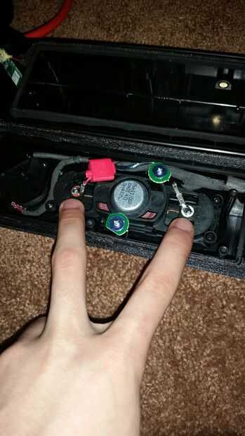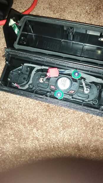 Bueno, el primer paso en esta parte es ver donde están los altavoces en su barra de sonido. Mina son en la extrema izquierda y extrema derecha. Hay espuma como material que cubre el cable en la mayor parte de la barra de sonido pero en ambos lados hay 2 cables en cada lado uno rojo y otro negro que son visibles. Una vez que ha encontrado los dos cables asegúrese de probarlo antes de cableado y armar todo nuevamente. Conecte su sistema de altavoz del cableado a los 2 conectores he acentuado en la imagen. suma de rojo = rojo negro = negro. escuchar música y ver si el conjunto de altavoces. Si lo hiciste correctamente!