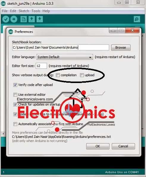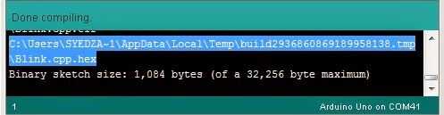 Abierto arduino Software y haga clic en archivo y luego preferencias y marque la opción "Compilación y carga" después de escribir el código, haga clic en compilar lo que recibirá el enlace de su Hex archivo en la salida vaya a colocar y el archivo Hex.