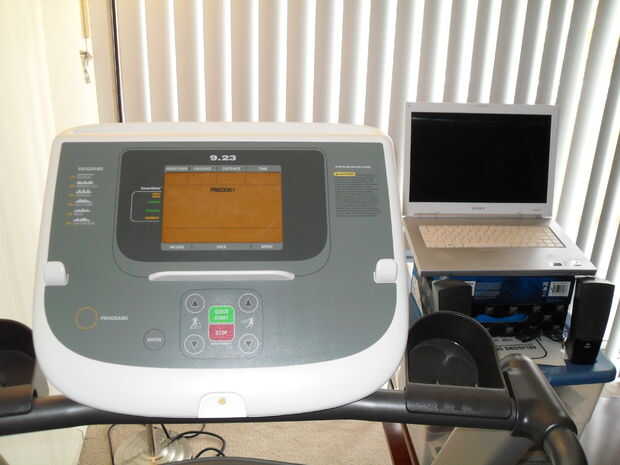 Para ello, será necesario: (1) un ordenador portátil, (2) un conjunto de altavoces [opcionales], (3) suficientes objetos para levantar la pantalla de 40 pulgadas [tipo y número de objetos puede variar] y (4) una cinta de correr u otra máquina de ejercicio estacionario.