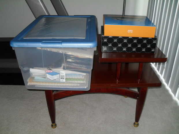 El primer paso en este proceso es para recoger algunos objetos para crear su base. En este caso, una pequeña mesa final se utiliza en combinación con un depósito y dos cajas pequeñas. Al seleccionar los objetos que utiliza, asegúrese de ir para los que le proporcionan una robusta base, ya que algunos potencialmente costosos equipos se depende de su estabilidad.
