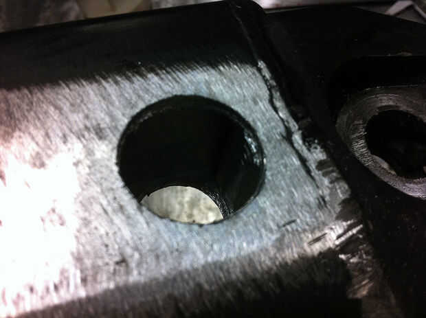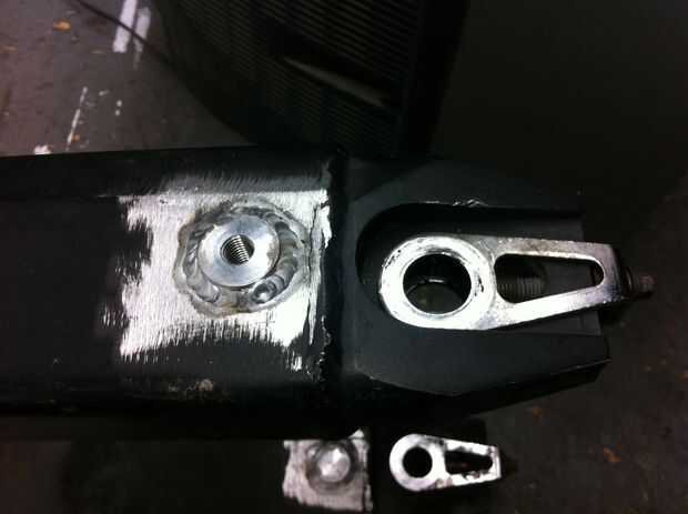 El siguiente paso es perforar agujeros en el basculante con un serrucho o broca de gran tamaño. Los agujeros deben ser lo suficientemente grande para caber los partes movibles comodamente, y los agujeros deben ser perpendiculares a la superficie externa del basculante. Una vez que han perforado los agujeros, limpiar el metal que los rodean y soldar con autógena los insertos en el lugar. Utilicé un soldador TIG en el TechShop.