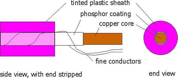 Hay dos colores de fósforo estándar para EL alambre: aqua azul (que es blanco con una clara cuando fuera de la envoltura) y el blanco (que es color de rosa cuando, debido a la adición de un fósforo rojo en la mezcla). Los otros colores (rosa, rojo, naranja, amarillo, verde lima, verde oscuro, azul oscuro y violeta) se logran filtrando la luz a través de una vaina externa color aqua. Aqua tiende a ser más brillantes, aunque el brillo se puede ajustar cuando se selecciona el controlador.