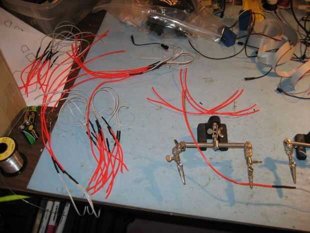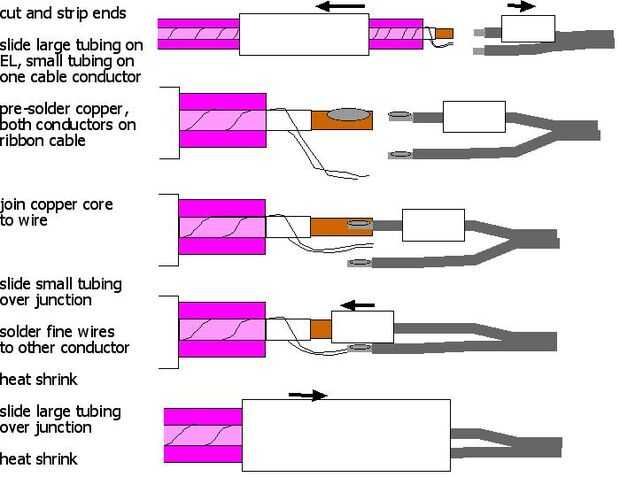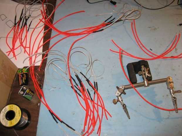 Cada pieza de alambre en su diseño, cortar la longitud adecuada (con al menos unas pulgadas extras en cada extremo) y al final de cada pieza a un conector o una pieza de doble conductor de cable de cinta que es suficiente para alcanzar al conductor de la soldadura. La polaridad no importa, cualquiera de los cables puede conectarse el núcleo central o los alambres exteriores. Hay muchos métodos para soldar EL alambre, para cualquiera de estos usted debe terminar con una región reforzada con cubriendo la Unión de la tubería del encogimiento del calor.