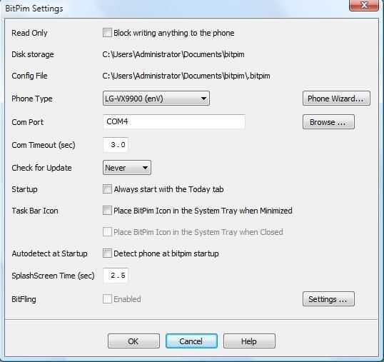 BitPim debería detectar automáticamente el teléfono. Si no lo hace, ir a: Editar > configuración.