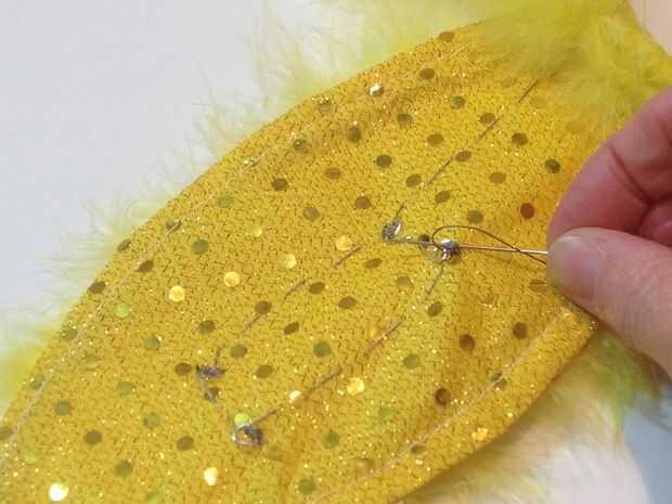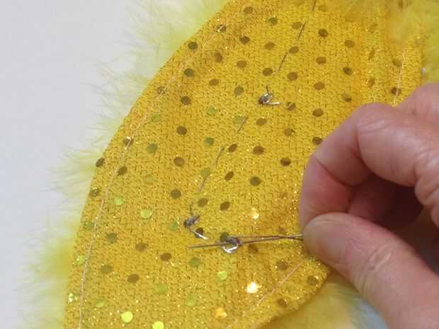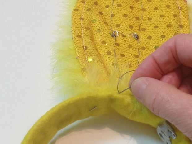 Puntos de funcionamiento hasta la cabeza, tomando la aguja por la tela de la cinta en el interior de la banda donde se sentará el interruptor de la puntada (ver imagen 14). Suturar un lado del interruptor sobre la tela de la cinta para la cabeza (ver imagen 15).