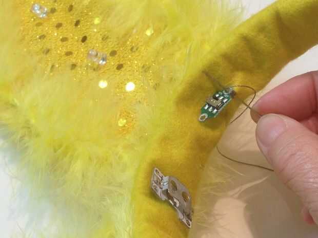 Sin cortar el hilo, seguir las puntadas invisibles a lo largo del borde de la cinta hasta llegar al punto debajo de LEDs 1 y 2. Tomar el hilo de rosca en los oídos, oversewing las patas positivas en ambos LEDs. Los 4 lados positivos de los LEDs ahora se unen a un lado del interruptor (ver imagen 16).