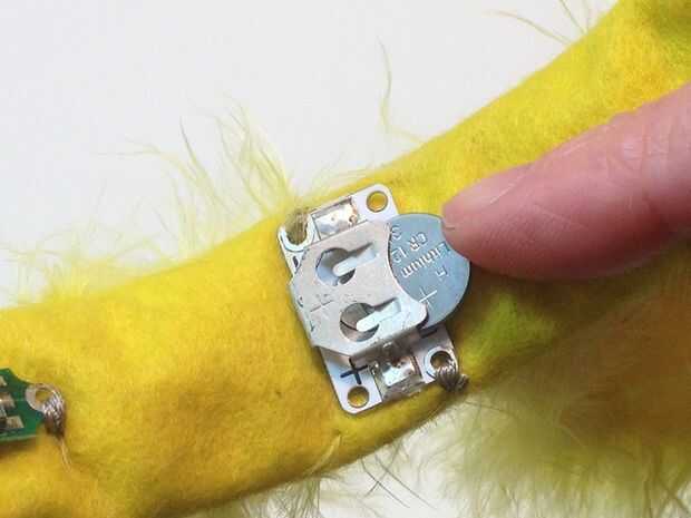 El circuito en la parte posterior de las orejas puede ser ocultado por costura o pegado un trozo de tela sobre la parte superior. Las orejas en la imagen están decoradas con plumas y estos también podrían ser utilizados para disfrazar el circuito.
