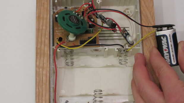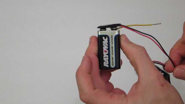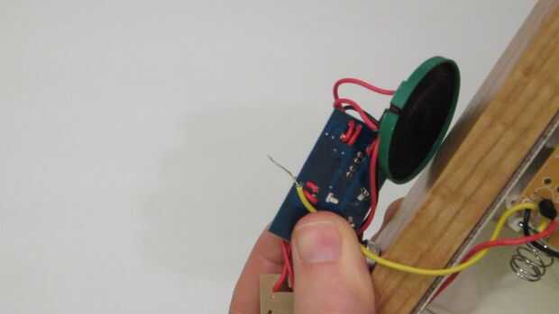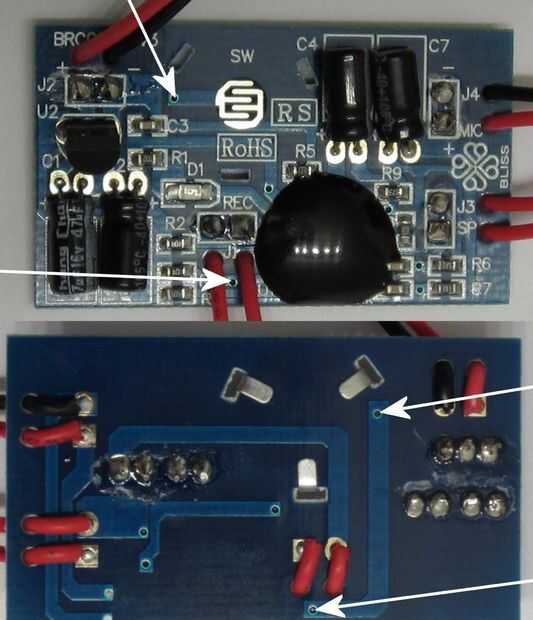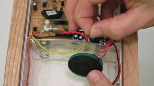 El cable negativo del altavoz se utilizará para conectar el transistor de salida del receptor para el pasador de juego en el módulo de la grabación. Uno de los extremos del cable ya está conectado a los transistores de salida. Tan sólo necesitamos conectar el extremo libre a uno de los agujeros de perno de juego que fueron mencionados en el paso 2. No necesitas soldar el cable para el módulo de la grabación. Puede hacer una buena conexión a torcer los cables alrededor de la Junta. Para ello, inserte algunos filamentos del alambre a través de uno de los agujeros (el orificio es probablemente demasiado pequeño como para caber el cable entero). A continuación trence los hilos de alambre de vuelta. Como los cables están firmemente, debe hacer una buena conexión y permanecer en el lugar.