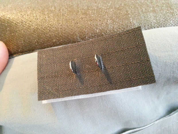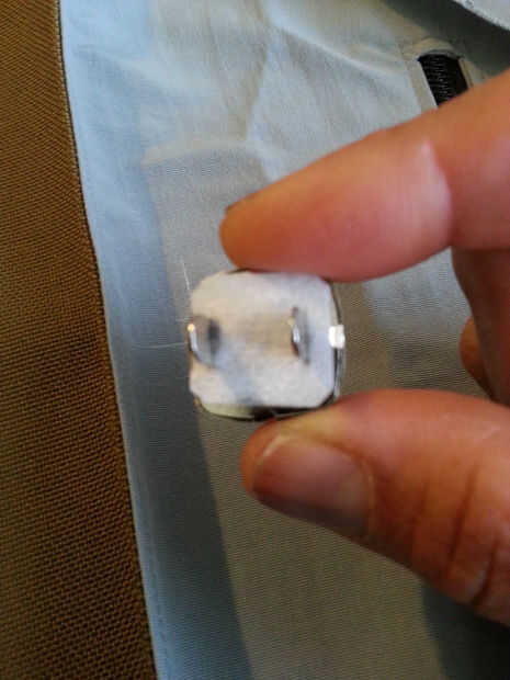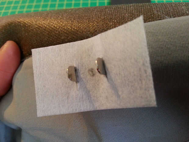 Ahora que usted corte las rajas pequeñas para las patas de la snap, seguir adelante y poner el imán a través de. Vuelta a la tela y usted verá las piernas del imán en el otro lado.