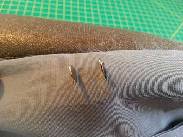 Una vez que han convertido a la tela alrededor, inserte la pieza de entretela, luego el pedazo de tela pesada. Recuerde que las dos piezas deben ser más largos que el complemento. El propósito de añadir estas dos capas es para proteger el revestimiento de conseguir usada o corte de las piernas del metal de la presión y también para añadir soporte para el revestimiento.