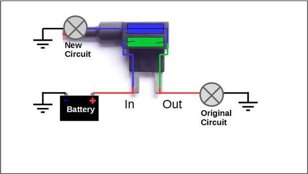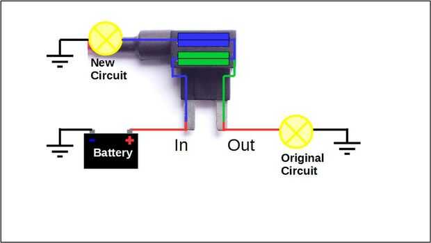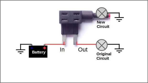 La ranura inferior de agregar un adaptador de fusible es para el fusible de origen (5) que, como siempre, completa el circuito original (6).