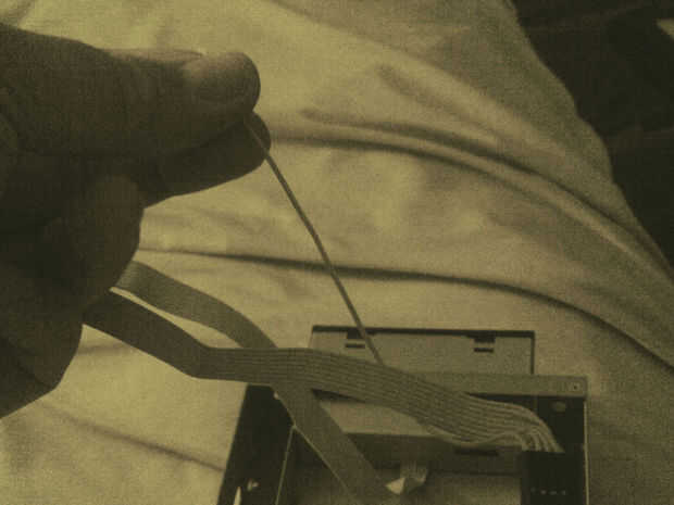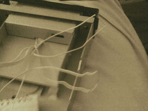 Separe ambos cables (marcar si es necesario) y utilice la hoja para cortar una raja abajo ambos cables, y son donde los cables en medio de la raja y cuidadosamente utilizar un alicate y sacar sólo el OUTTER plástico vivienda. NO CORTE LOS CABLES. (una vez más necesitaba ambas manos para esto)