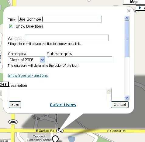 La característica de las funciones especiales es para agregar enlaces internos más avanzados (enlaces de marcador de uno mapa a otro en el mismo mapa). Realmente no he explorado. El siguiente paso le proporcionará algún código html básico, para agregar enlaces adicionales y un enlace de correo electrónico a la casilla de descripción de su marcador.