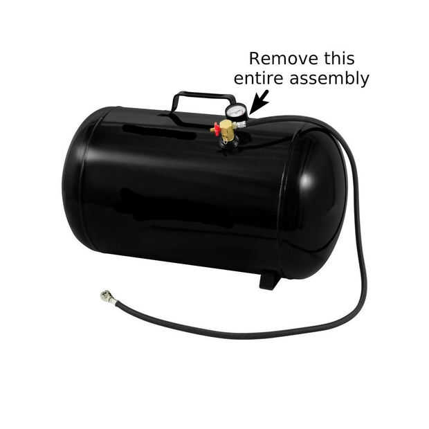 • El paso uno cuando trabajo en el nuevo tanque receptor de aire quitar todo el conjunto de la parte superior del tanque. Puede mantener la manguera como un extra pero no va a utilizar alguna de estas piezas en esta instalación.
